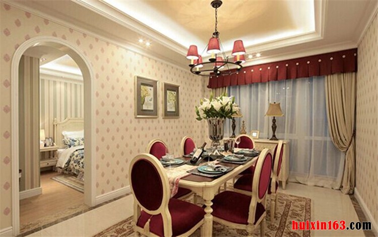 本套房屋装饰比较具有特色,客厅中的墙壁上粘贴了白色带有淡淡图案的壁纸,整体效果可以带给人们一种温馨、甜蜜的感觉,石膏板吊顶则采用了平顶式的设计,在四周的夹层中安装了一圈白色的灯带,为客厅增加了光源,中间一盏带有水粉色灯罩的灯饰,在白色灯带的照射下显得更加唯美、精致,餐厅中选用了一款长形的餐桌,桌角使用了圆滑的设计手法,搭配上枚红色的座椅更显高档、时尚,卧室的装饰风格比较注重舒适感,没有过多的饰品装饰,一切都更加注重质感与色彩的搭配,整体的色调与质地的搭配,可以使空间设计显得更加和谐,从而带给人们一种舒适感。